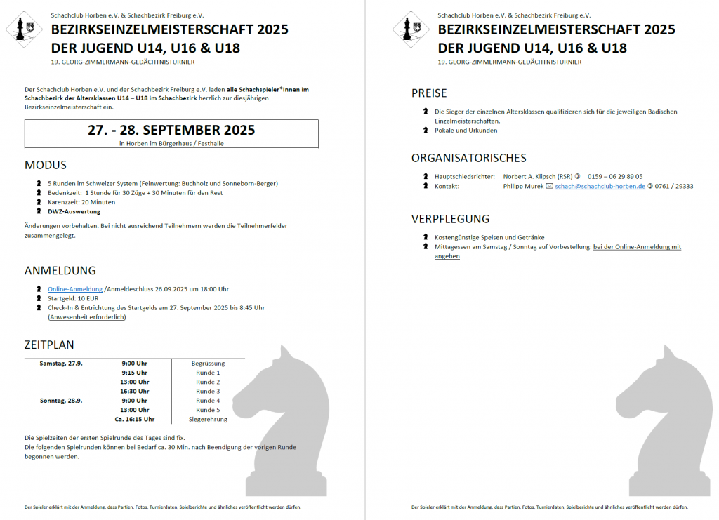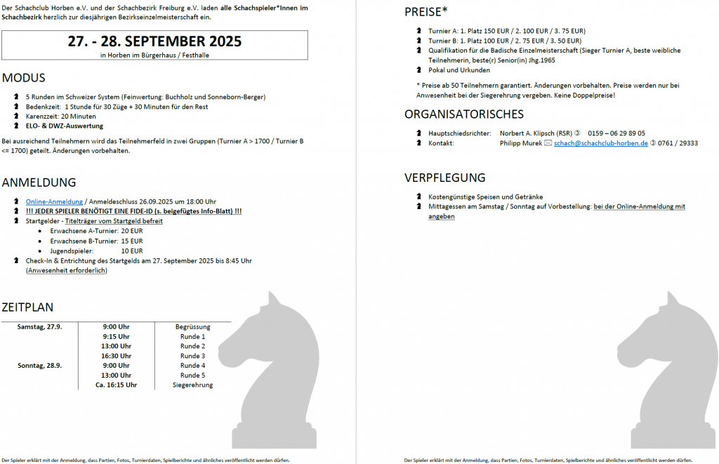 27. – 28. September | Horben | Bezirkseinzelmeisterschaft Bezirksjungendeinzelmeisterschaft | siehe unten |