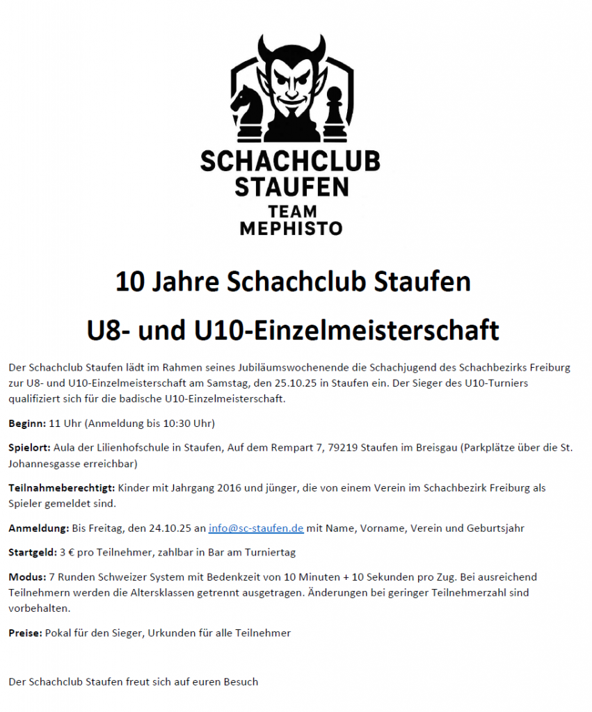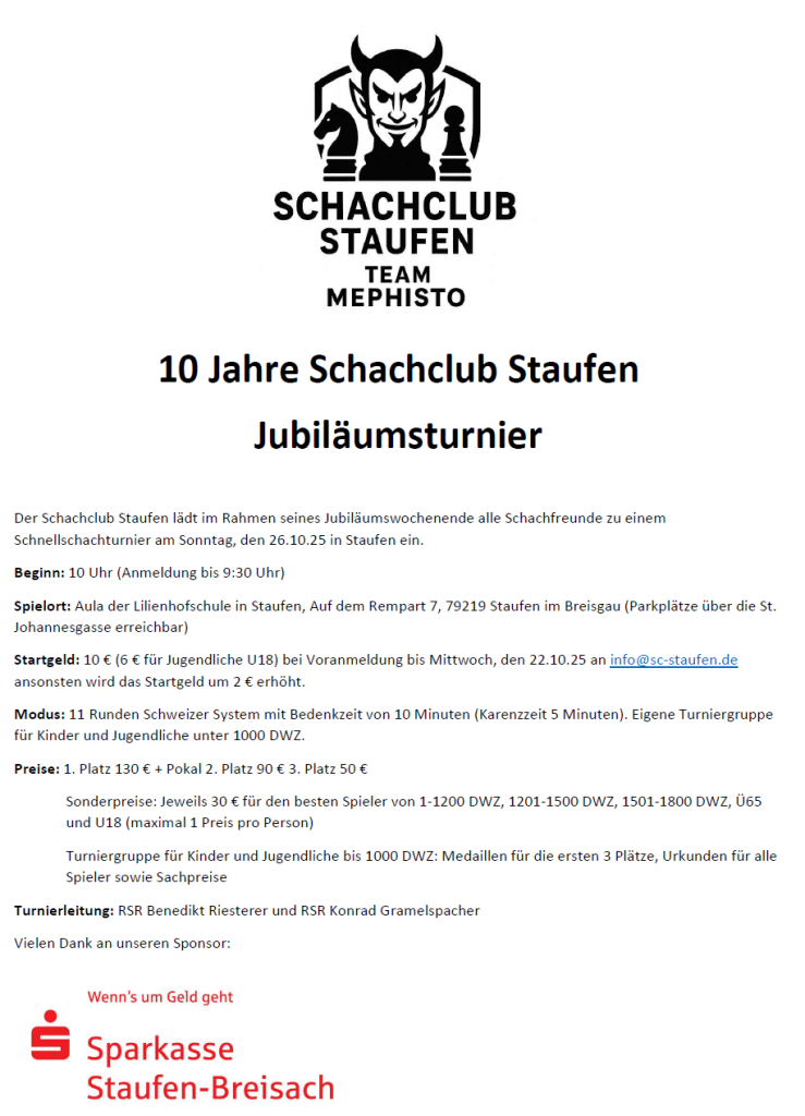 26.10.2025 | Staufen | Jubiläumsturnier | Aula der Lilienhofschule in Staufen, Auf dem Rempart 7, 79219 Staufen im Breisgau |