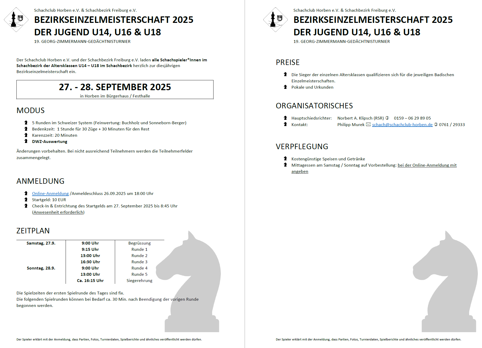 27. – 28. September | Horben | Bezirkseinzelmeisterschaft Bezirksjungendeinzelmeisterschaft | siehe unten |
