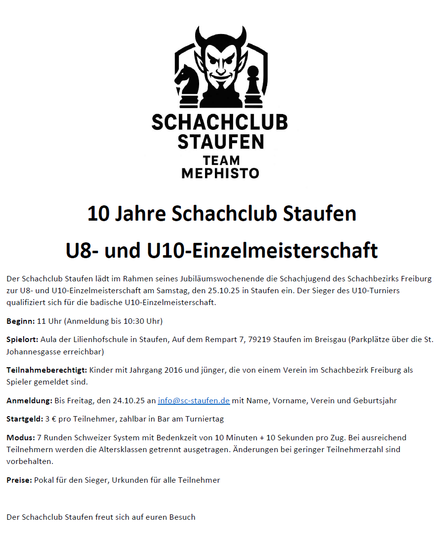 26.10.2025 | Staufen | Jubiläumsturnier | Aula der Lilienhofschule in Staufen, Auf dem Rempart 7, 79219 Staufen im Breisgau |